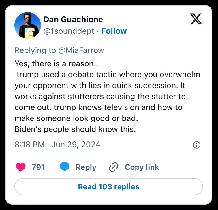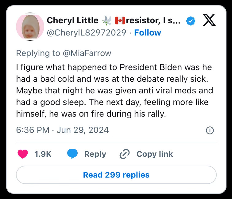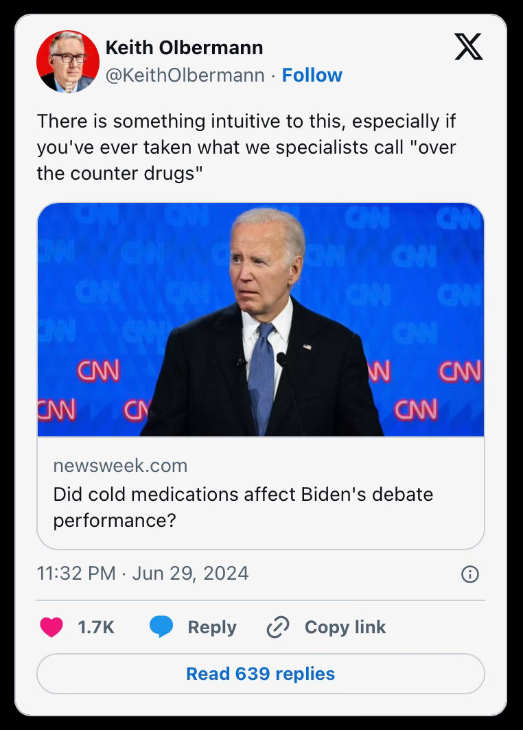 Supposedly, Joe Biden had a cold during his political death, er, debate with Trump, after we had been told for years that he has a stutter. A stutter? Please. A cold? You know what? I can believe that. You could hear it in his voice. That must’ve been the reason the president was in a zombified state.