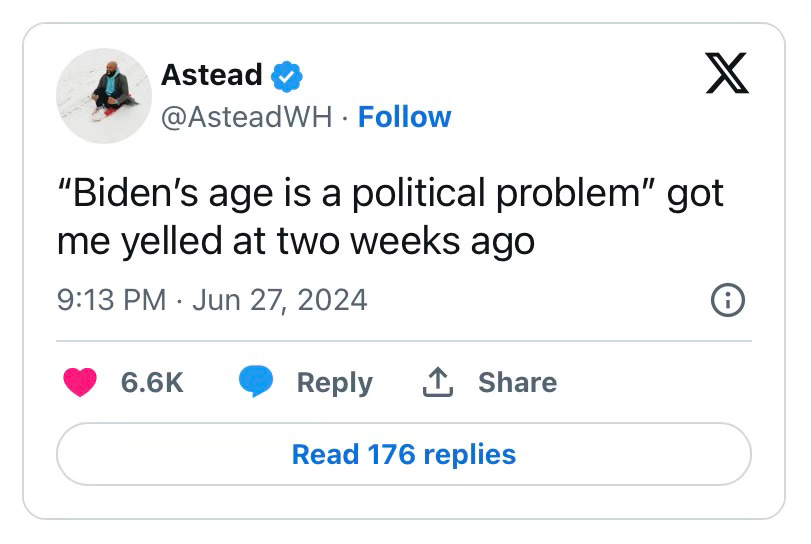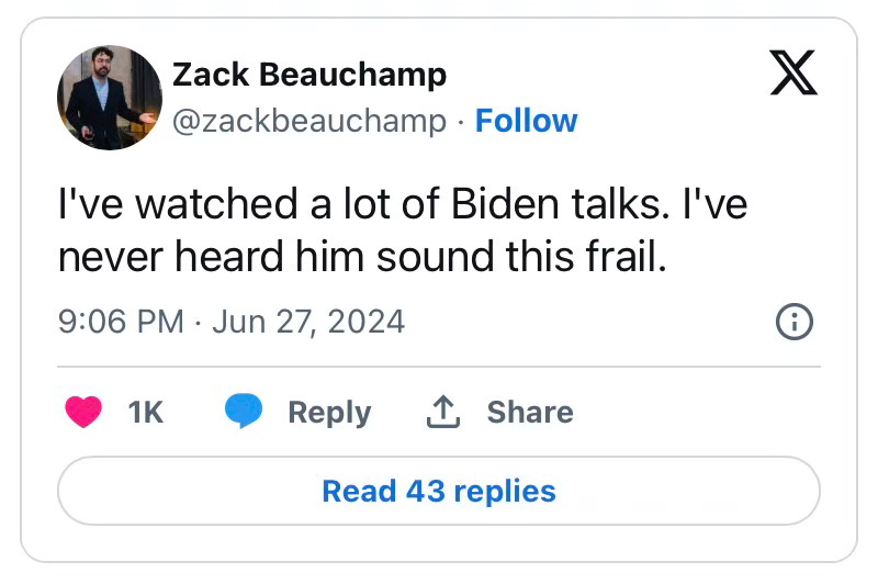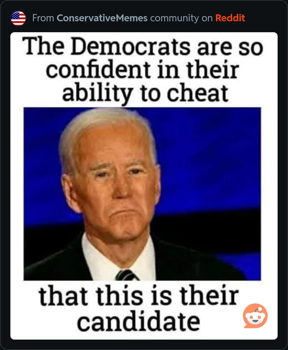 The cabal knew Joe Biden was an unpopular vegetable and had planned on running him again regardless. That should terrify the public. As a popular meme pointed out, the democrats were so confident in their ability to cheat that he was their candidate. That is, before he took a shit at the debate. Figuratively and probably literally.
